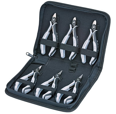 Укомплектована 6 прецизионными плоскогубцами для электроники, антистатическими ESD. Футляр из прочного полиэстера, крепление щипцов из резиновой эластичной ленты, замок на молнии.