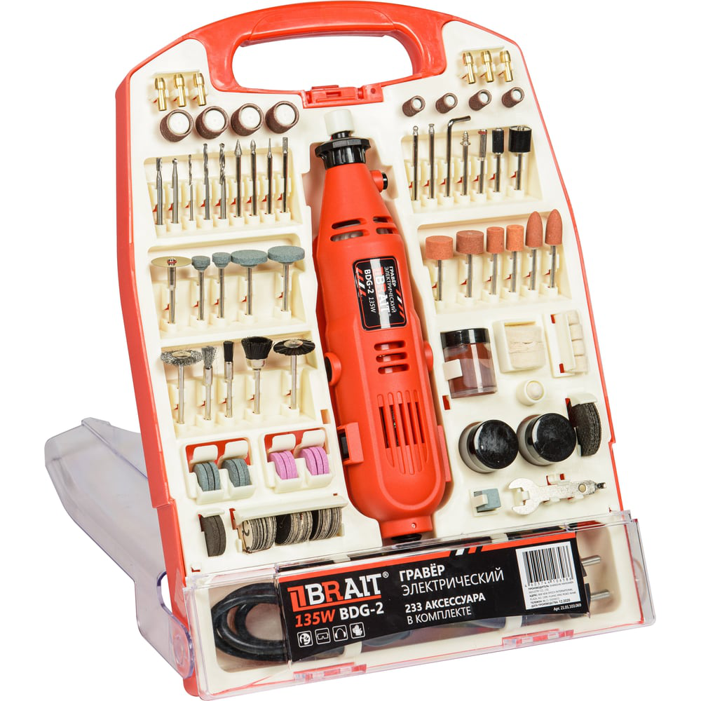 Электрический гравер BRAIT BDG-2 233 предмета 21.01.103.069 предназначен для выполнения широкого спектра работ, таких как: резка, сверление, полирование, гравирование, фрезерование и зачистка. Применяется для обработки твёрдых и мягких материалов. Имеет обрезиненную рукоятку для надежного удержания при работе. Блокировка шпинделя обеспечивает быструю замену оснастки. Модель укомплектована большим количеством аксессуаров и гибким валом для работы в труднодоступных местах. Включает в себя 233 насадок такие как: сверла, пильные диски, шлифованные, полировочные и отрезные круги, цанги т.д. Набор оснащен удобным кейсом ,в котором все инструменты зафиксированы в собственных нишах, что облегчает смену насадок, так же такой набор удобно хранить и переносить.