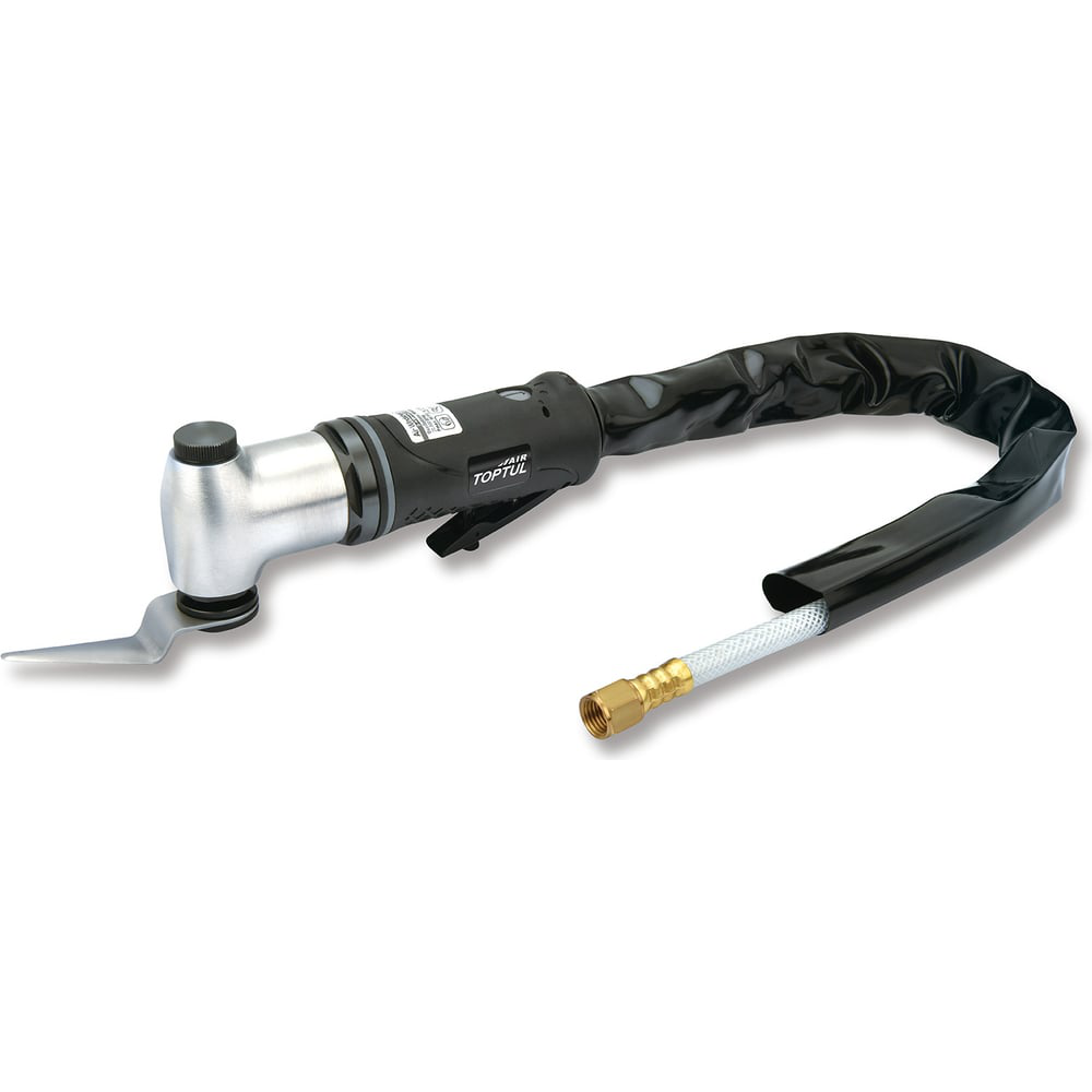 Пневмонож для срезки стекол TOPTUL KBHA0120 применяется для удаления старых прокладок, уплотнителей, краски, герметика, срезка стекла, резки материалов. Дополнительные характеристики: Частота хода: 20 000 об/мин Дуга хода: 2º Минимальный воздушный шланг: 10 мм Резьба входного отверстия 1/4" Уровень звукового давления 80 дБ (A) Уровень мощности звука 91 дБ (A) Уровень вибрации 14 м/с 2 Общая длина: 195 мм