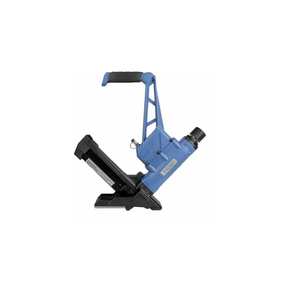 Пистолет пневматический для паркета FROSP FNS50 26541 предназначен для укладки паркетной доски, ламината и других напольных покрытий. Емкость магазина составляет 100 гвоздей либо 60 скоб, длиной от 38 до 50 мм с L-образной шляпкой в пластине. Он имеет уникальную конструкцию, которая позволяет пристреливать паркет встык к фанере. В задней части инструмента курок для более точной пристрелки, который срабатывает при ударе. Профессиональный и мощный пистолет предназначен для быстрой и удобной работы.