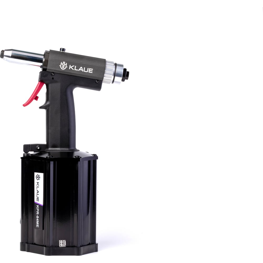 Заклёпочник пневматический для вытяжных усиленных заклёпок, в том числе типа Bulb.Заклепочная техника KLAUE KPR-84ME предназначена для работы с заклепками из любых материалов (алюминий, сталь, нержавейка), большим диаметром – 5,2; 6,3; 7,6мм. Инструмент для распорной заклепки рассчитан для использования на крупносерийных производствах в условиях многочасовой бесперебойной работы.Данный тип пневматического пистолета для вытяжных заклёпок разрешён для применения на объектах повышенной взрыво - и пожароопасностью. Работа инструмента для заклепок происходит за счёт подачи сжатого воздуха.диаметр заклёпок 5,2 мм – 6,3 мм – 7,8 ммсила вытягивания 14 220 Н – 19 820 Нрабочий ход 26 мм