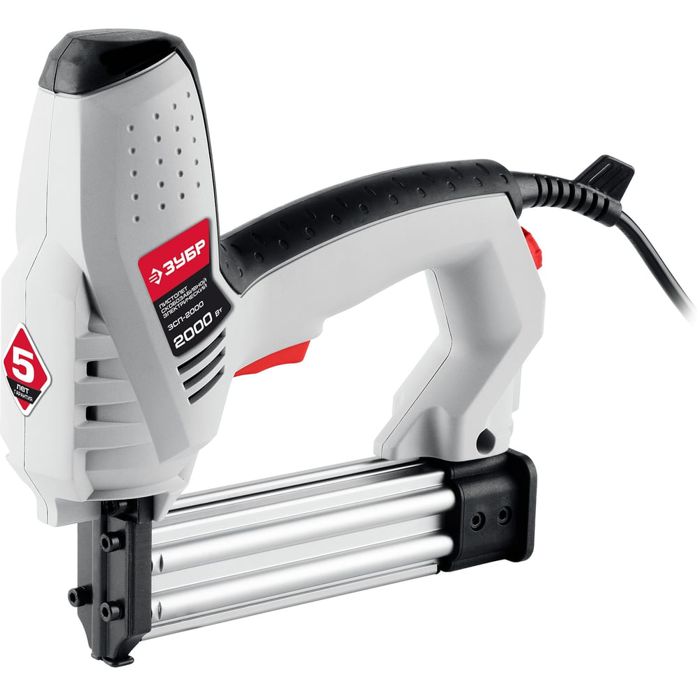 Скобозабивной пистолет ЗУБР ЗСП-2000 - простое и удобное изделие для разнообразных работ: скрепления деталей, фиксации материалов, закрепления подвесных элементов и многого другого. Сочетает в себе большую силу удара с плавной регулировкой, защиту от срабатывания ″вхолостую″, встроенный магазин большой емкости - все что надо для комфортной, безопасной и длительной работы. Применяется для крепления различных материалов (тканей, пленок, кожи, панелей и т.д.), а также для соединения изделий из различных материалов (дерева, пластика) при строительных, отделочных и ремонтных работах. Двойная защита от случайного срабатывания для дополнительной безопасности: основной выключатель полностью отключает питание; блокировка курка от срабатывания без упора в материал.