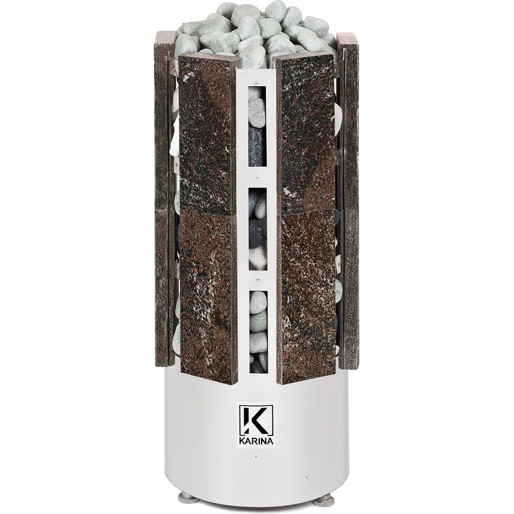 Электрокаменка Karina Forta 6 Амфиболит выполнена в напольном варианте и обладает цилиндрической формой дополненной плитами из натурального камня Амфиболита. Напряжение питания - 220/380В. Данная модель имеет 3 тэна, расположенных в виде треугольника. В центре внизу расположен бак для воды емкостью 3 л, который является парогенератором. Выше парогенератора имеется емкость под мелкие камни или нержавеющие шары объемом 2.5 л, вмещающая 5 кг мелкого камня, называемая закрытой каменкой с воронкой для подачи воды.Если в парогенератор не заливать воду, то каменка разогреет парную до высокой температуры (100 -120°C) с относительной влажностью воздуха 10-12% - режим сухой бани (финская сауна). Если залить воду в парогенератор, то при разогреве парной вода будет испаряться и увлажнять воздух до режима русской бани (60-70°C и 40-50% влажности). В обоих случаях возможно использование закрытой каменки, которая дополнительно прибавит мелкодисперного необжигающего пара.Управление электропечью осуществляется с помощью выносного пульта, который не входит в комплектацию и приобретается дополнительно. Благодаря выносному управлению каменку можно установить в различных местах парильного помещения, а при комбинации с фланцем можно встроить ее в полок.Все корпусные элементы печи выполнены из нержавеющей стали. Нагревательный элемент - ТЭН диаметром 10мм. Наружный кожух каменки дополнительно облицован плитами из Амфиболита толщиной 40мм, что придает ей еще большую теплоемкость.