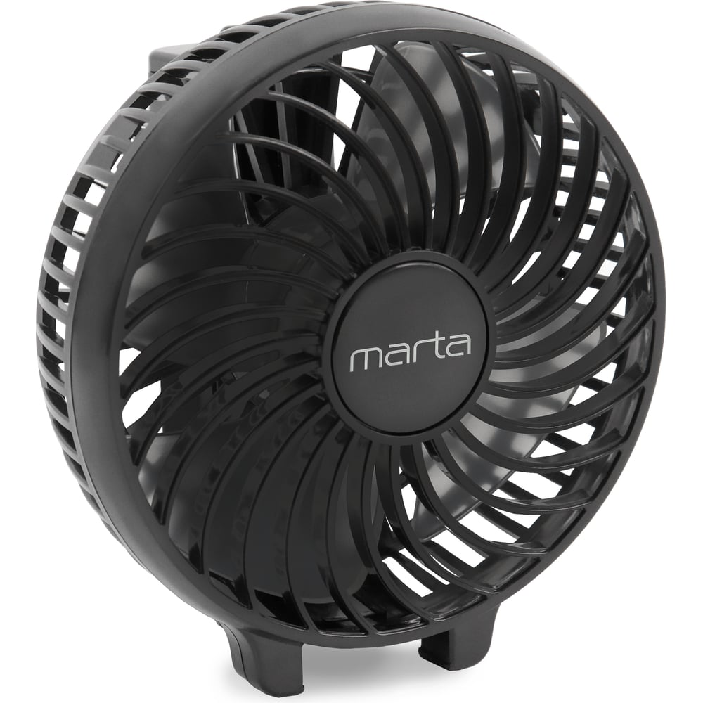 Портативный USB вентилятор Marta работает от встроенного литий-ионного аккумулятора ёмкостью 1800 мА/ч (типоразмер 18650) Время работы от аккумулятора до 7 часов Складная ручка Три скорости работы LED-индикатор работы и зарядки Петля для подвешивания Зарядка аккумулятора от USB порта, кабель USB-microUSB в комплекте Компактные размеры и складная ручка сделает вентилятор незаменимым как дома, так и в дороге
