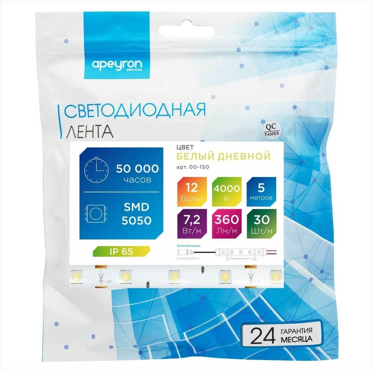 Расширенная гарантия на товар составляет 2 года. поставщик рекомендует использовать лампы накаливания с цоколем не указан для освещения площади не указана м2. Светодиодная влагозащищенная лента Apeyron 7,2W/m 30Led/m 5050SMD дневной белый 5M 00-150 в современном стиле используется в интерьере не указан с установкой не указано.