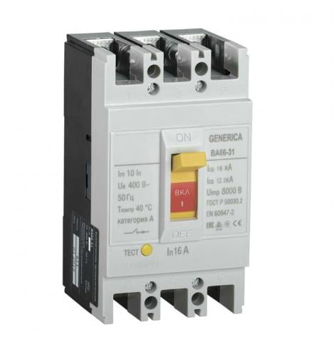 Автоматические выключатели ВА66 GENERICA предназначены для проведения тока в нормальном режиме и отключения тока при коротких замыканиях, перегрузке, а также для оперативных включений и отключений участков электрических цепей.Рассчитаны на эксплуатацию в электроустановках с номинальным рабочим напряжением до 400В и на номинальные токи от 16 до 250А.