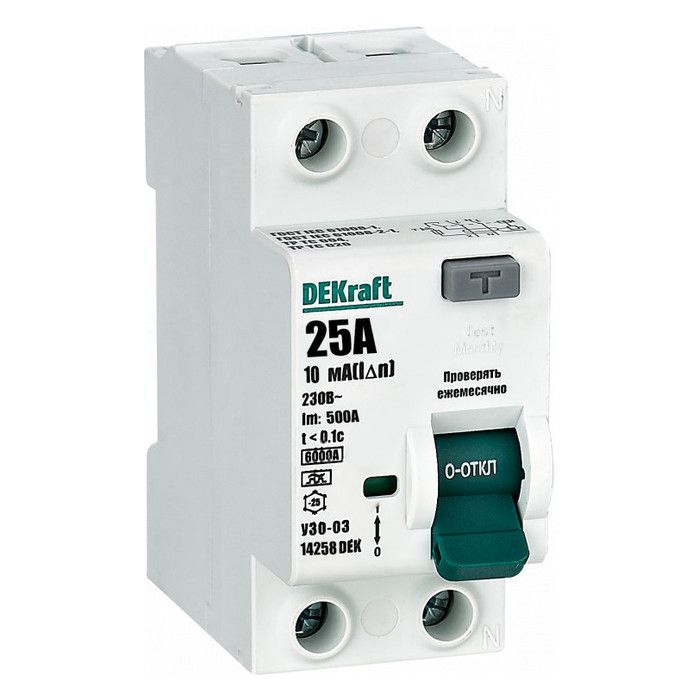 УЗО DEKraft УЗО-03 2P 25А 6 кА, 10 мА (A), 14258DEK - это двухполюсное устройство защитного отключения, предназначенное для обеспечения безопасности электрических сетей и оборудования. УЗО имеет номинальный ток 25А, предельную отключающую способность 6 кА и чувствительность 10 мА. Продукт отличается надежностью, качеством и соответствием всем стандартам безопасности. УЗО DEKraft подходит для использования в домашних, коммерческих и промышленных целях, обеспечивая надежную защиту от утечки тока и перегрузок.